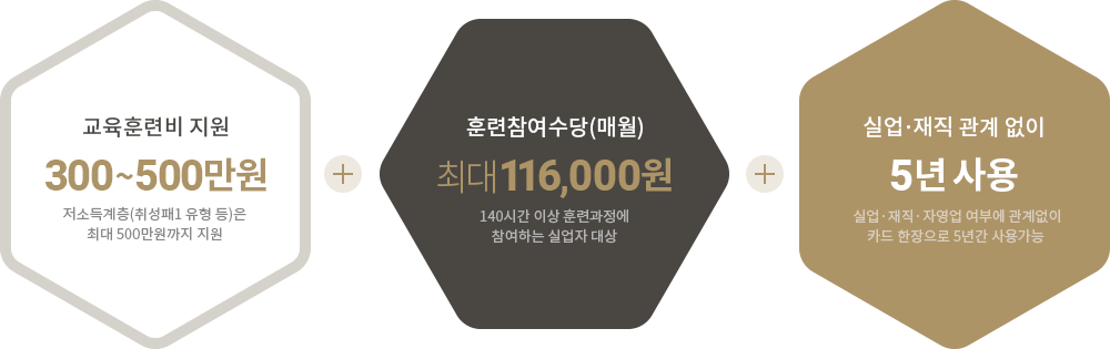 * ½Ç¾÷ÀÚ,Àú¼Òµæ ÀçÁ÷ÀÚ(±Ù·ÎÀå·Á±Ý ¼ö±ÞÀÚ)´Â 140½Ã°£ ÀÌ»ó ÈÆ·Ã Âü¿© ½Ã ¿ù ÃÖ´ë 116,000¿øÀÇ ÈÆ·ÃÀå·Á±Ý Áö±Þ±¹¹Î³»ÀϹè¿òÄ«µå Áö¿ø³»¿ë Áö¿ø´ë»ó ÈÆ·Ãºñ Áö¿øÀ² ±¹¹Î³»ÀϹè¿òÄ«µå ¼ÒÁöÀÚ ÃÖ´ë 300¸¸¿ø Çѵµ·Î ÈÆ·Ãºñ 45~85% Áö¿ø Ãë¾÷¼º°øÆÐŰÁö 1À¯Çü ÃÖ´ë 500¸¸¿ø Çѵµ·Î ÈÆ·Ãºñ 50~85% Áö¿ø Ãë¾÷¼º°øÆÐŰÁö 2À¯Çü ÃÖ´ë 300¸¸¿ø Çѵµ·Î ÈÆ·Ãºñ 80~100% Áö¿ø